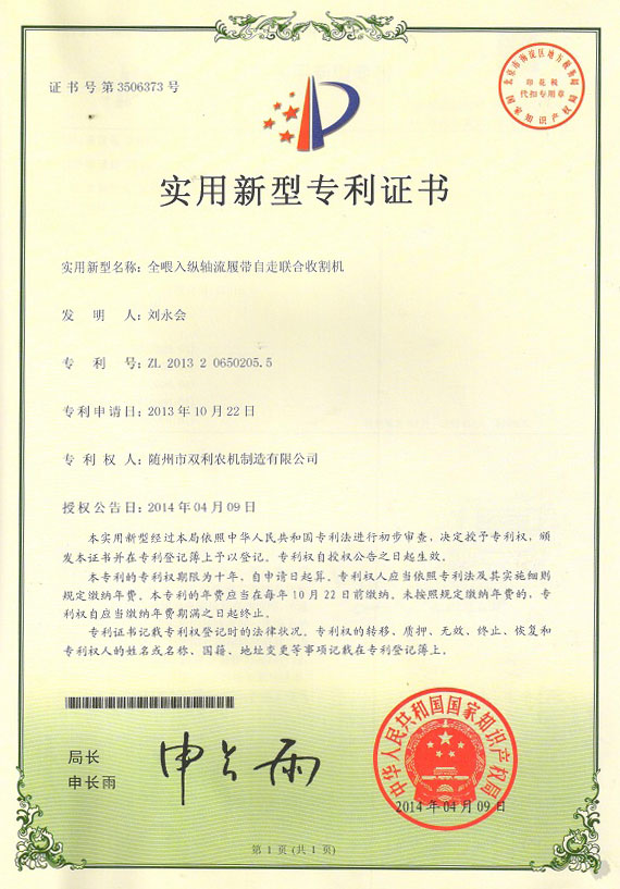 湖北雙利農(nóng)機(jī)制造有限公司    質(zhì)量承諾:本公司產(chǎn)品的三包期限為自安裝調(diào)試合格之日起一年